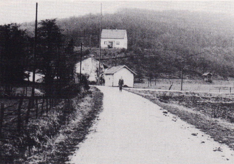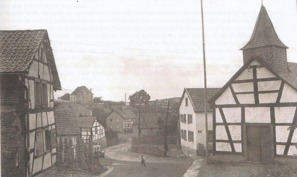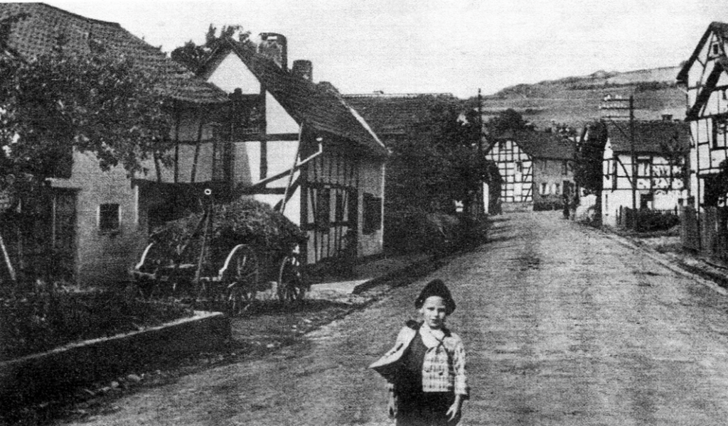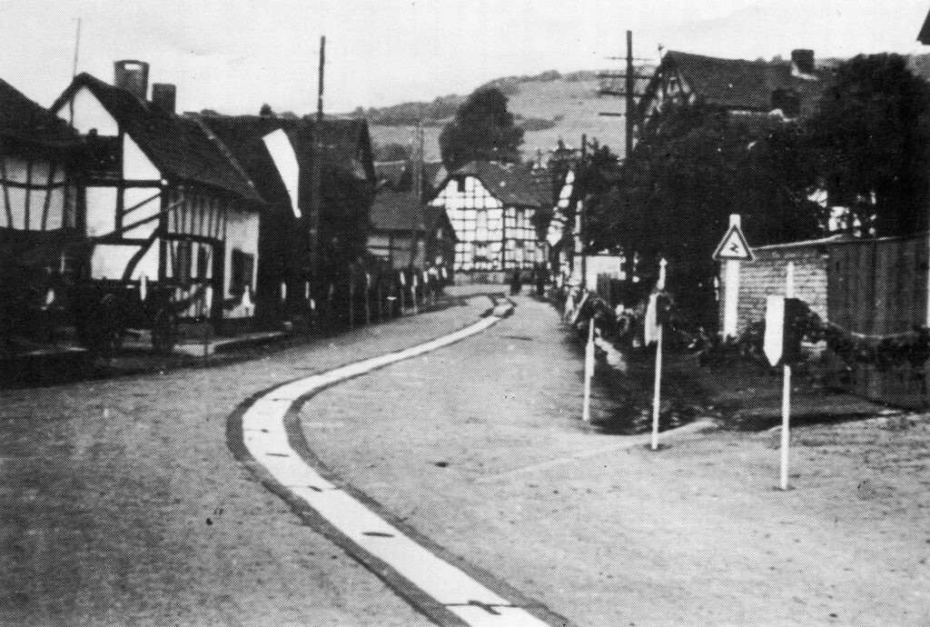 Das Bild zeigt eine Dorfansicht aus der Zeit, bevor die Schule gebaut, vermutlich aus den 30’er Jahren. Es ist kein Automobil, sondern nur ein Fuhrwerk zu sehen. Der Abwasserkanal verläuft in der Mitte der Straße die Wohl noch nicht asphaltiert ist. Das Verkehrszeichen und die Freileitungen passen zu dieser Zeit. Die Häuser wurden im Zuge des Neubaus von Schule und Feuerwehr abgerissen. Die Häuser erscheinen in einem guten Zustand, was sie zum Zeitpunkt des Abrisses nicht mehr waren. Im Hintergrund ist das Haus Trierer Straße 8 zu sehen. Das Bild zeigt die nahezu gleiche Perspektive nur ein paar Jahre früher, da der Abwasserkanal fehlt.