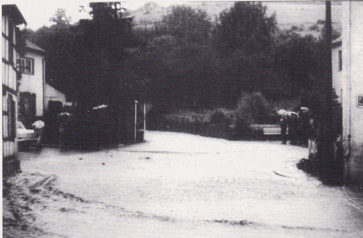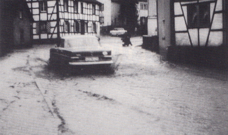 Wasser gab es in Vussem schon immer. Gerade aus, der Höhenweg, linke Hand das Haus Trierer Straße 8/10, Familie Mießeler, und hinten links Trierer Straße 9, Familie Schmidt. Das Fahrzeug könnte ein ein Opel Kadett/ Rekord sein.Hochwasser in Vussem 1969