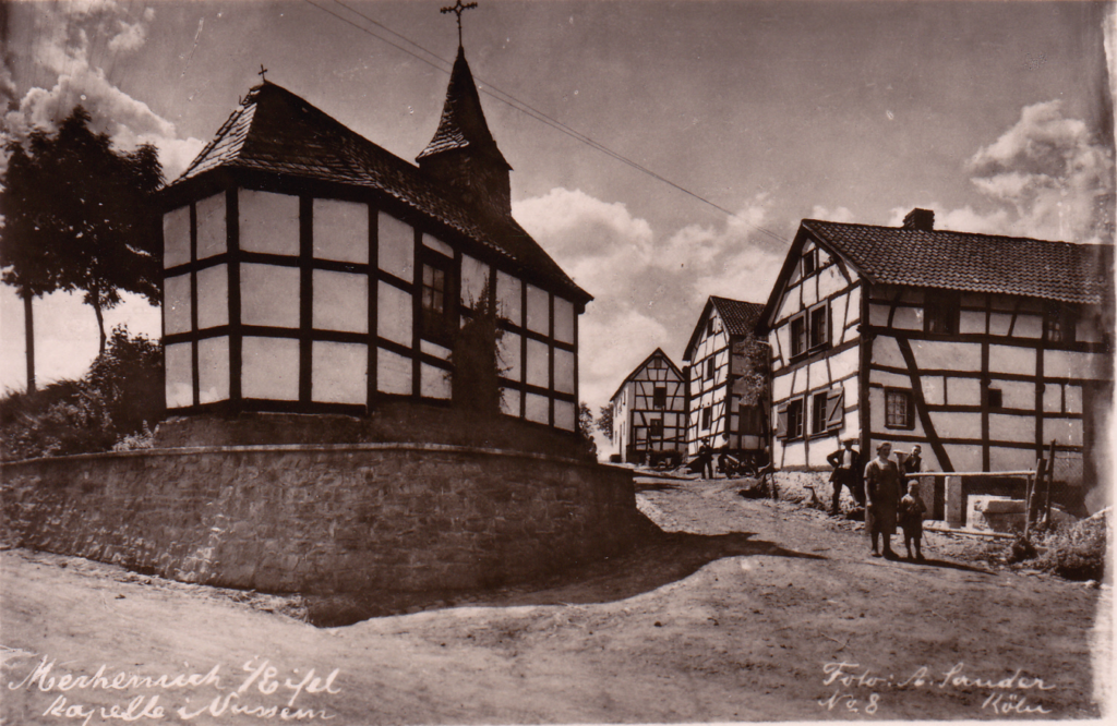 Quelle/ Info: Das Anwesen Keilbergweg 3, im Ort bis heute unter dem Hausnamen „Scheffes“ oder Haus Korioth bekannt, gehört zu den ältesten erhaltenen Hofanlagen in Vussem. Obwohl das genaue Baujahr nicht überliefert ist, dürfte das Gebäude ein Alter von über 200 Jahren haben und ist als charakteristisches Fachwerk-Winkelgehöft aus dem 17. Jahrhundert ein bedeutendes Zeugnis regionaler Baugeschichte. Untrennbar verbunden ist das Anwesen mit der Familie Müller, die als älteste nachweislich im Ort ansässige Familie gilt. Ihre Präsenz lässt sich über mehr als 300 Jahre hinweg in Vussem zurückverfolgen. Mitglieder der Familie nahmen über Generationen hinweg wichtige öffentliche Aufgaben wahr, darunter Ämter als Schöffen, Wald- und Feldschützen sowie in jüngerer Zeit auch als Gemeinderatsmitglieder. Der Hausname „Scheffes“ leitet sich unmittelbar von dieser jahrhundertelangen Schöffentätigkeit ab. Es kann zudem vermutet werden, dass in früherer Zeit – möglicherweise sogar vor 1794 – hier das Herrengeding abgehalten wurde.